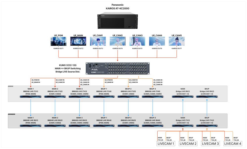 즉, 다수의 신호를 서로 다른 해상도, 프레임레이트, 포맷으로 동시에 만들어내면서도 전체 동기화를 유지하는 것이 핵심 과제였습니다. 이 지점에서 KAIROS AT-KC2000은 큰 역할을 했습니다. KAIROS를 통해 다양한 입력을 실시간으로 조합하고 필요한 해상도별로 자유롭게 레이어를 구성할 수 있었고, 출력 포맷이 달라도 하나의 시스템에서 손쉽게 관리할 수 있었습니다. AJA KUMO 3232-12G SDI 라우터를 통해 KAIROS의 출력 신호를 메인/백업 구조로 세팅하여 콘서트 현장과 온라인 플랫폼 송출단으로 전송하는 구조였습니다.
